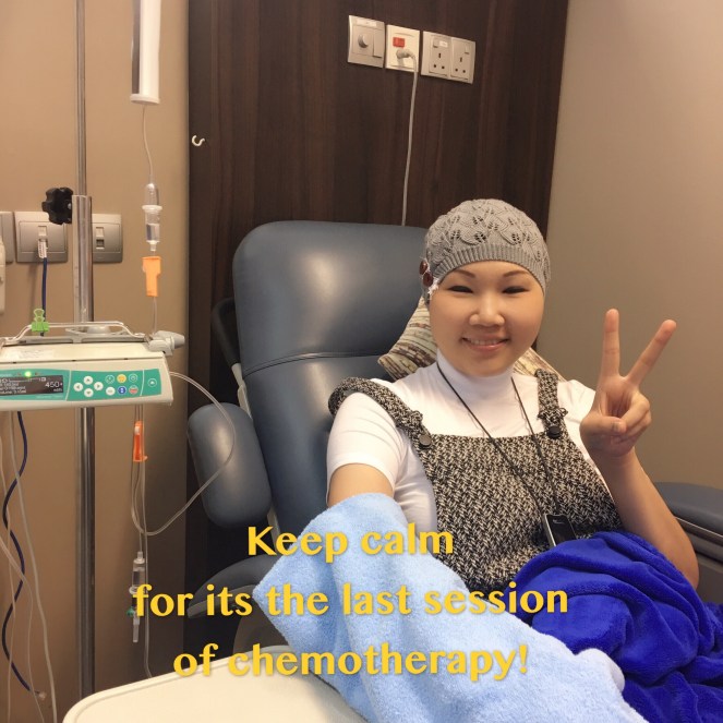 On my last session, everything went on smoothly with just some pain in my veins while undergoing the chemo. That type of pain I can endure. I told my aunt to take a photo of me having my last session of chemo. It’s a day of celebration for me as chemo is worse than operation and I have overcome the treatment! Thank God!